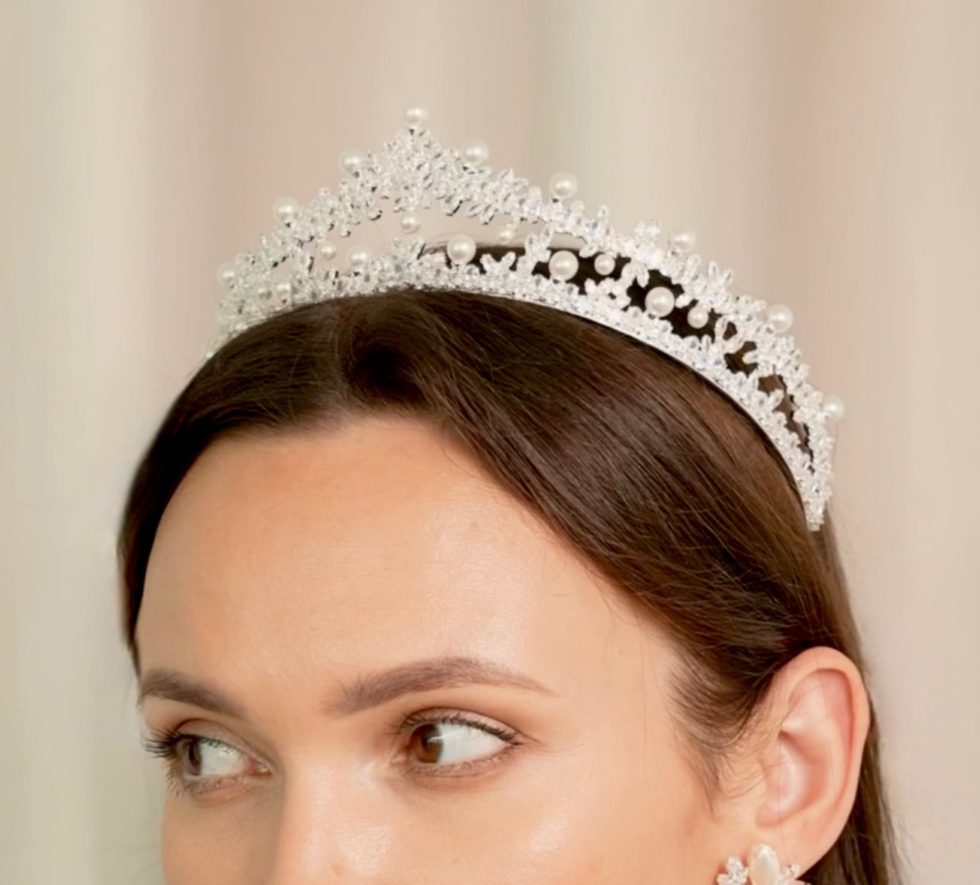 A regal bridal crown designed to illuminate your moment. This piece features a harmonious blend of lustrous pearls and high-grade zircon stones, meticulously arranged in a floral-inspired motif. Its structured height adds a graceful presence without overpowering, making it the perfect statement for brides who seek elegance with a touch of royal allure. Lightweight, radiant, and timeless.
