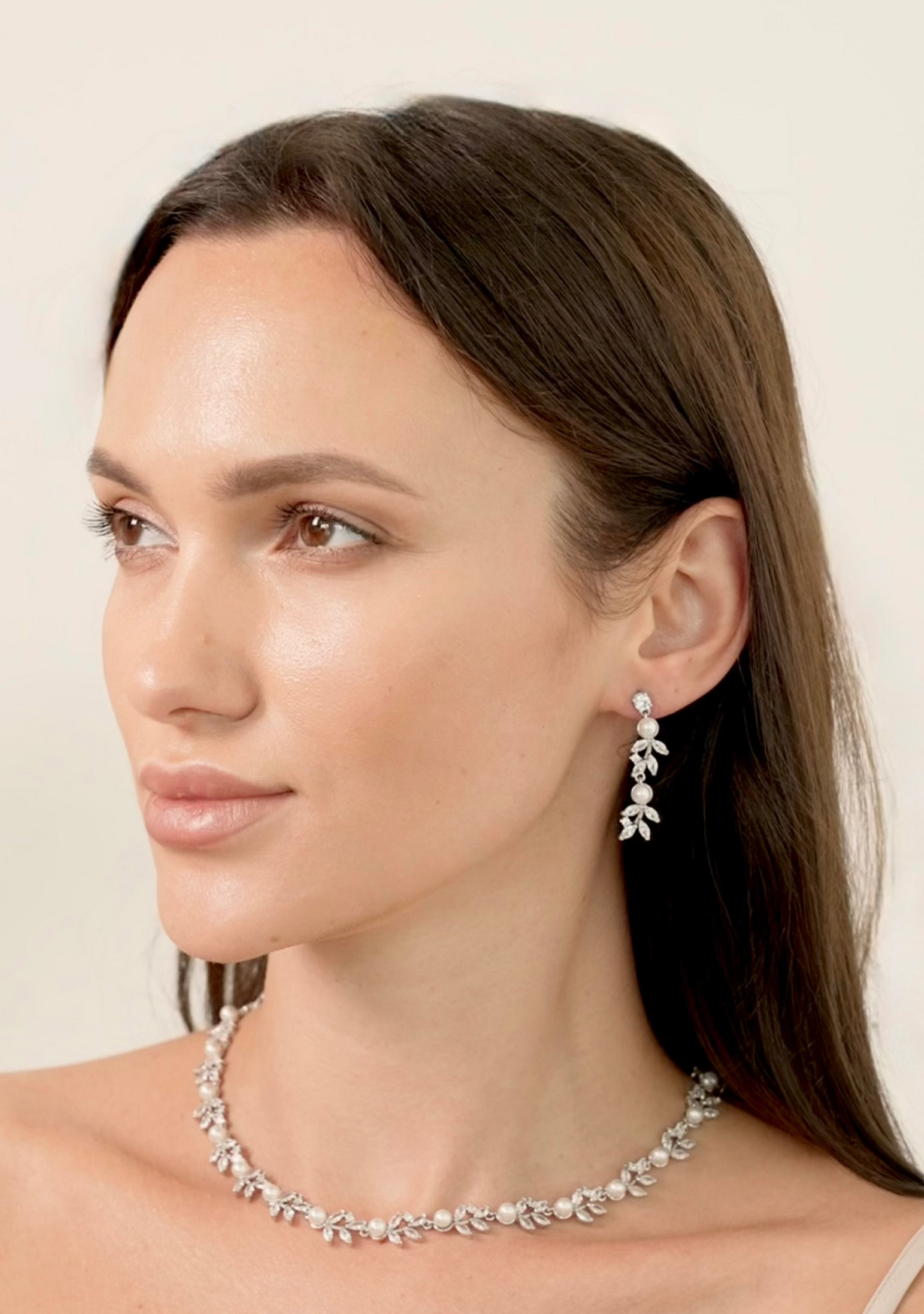 An instant classic! This complete 4-piece jewelry set (Necklace, Bracelet, Earrings, Ring) features an exquisite floral design pairing brilliant zirconia stones with elegant pearls. All pieces are expertly rhodium plated for a premium, non-tarnishing, high-shine finish. Perfect for weddings, galas, or special milestone celebrations.