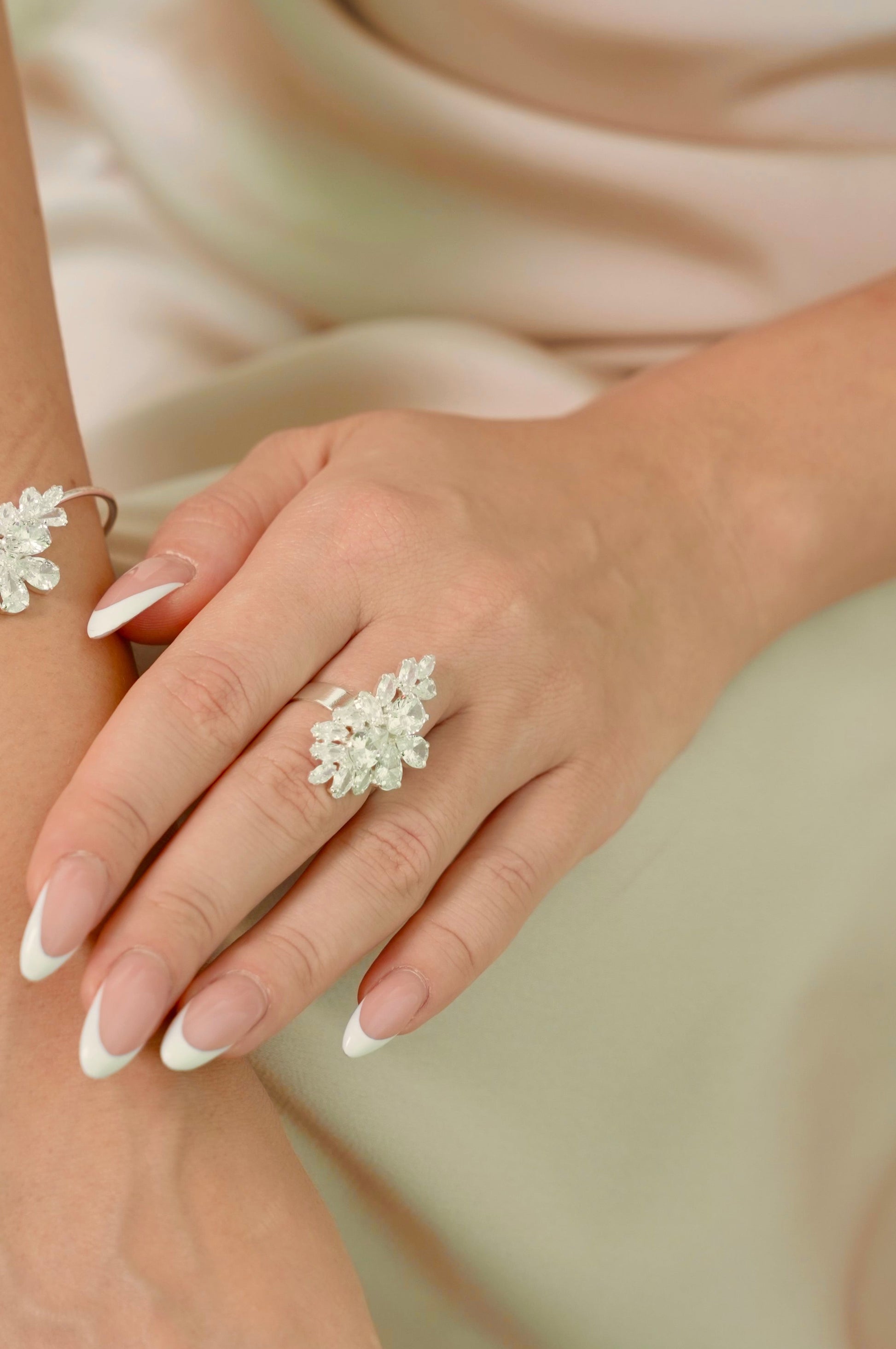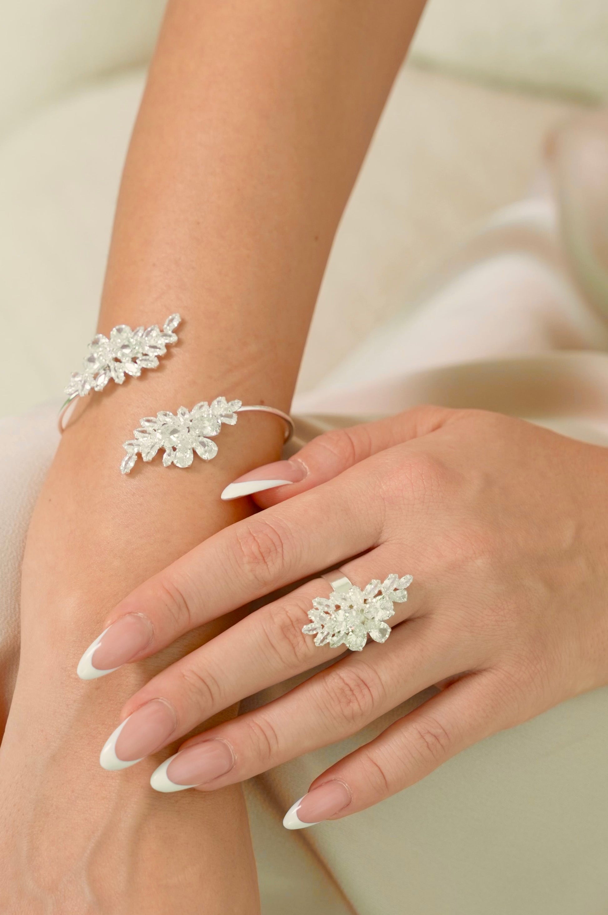 A timeless jewelry set designed for elegance in every detail. This set includes a delicate hand bracelet, a matching ring, and classic stud earrings. all adorned with brilliant Zirconia stones that shimmer with every movement.